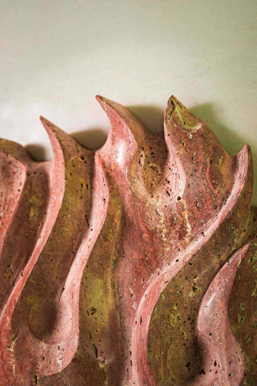 White Italian Marble and Red Iranian Travertine on a base of White Italian Marble.
